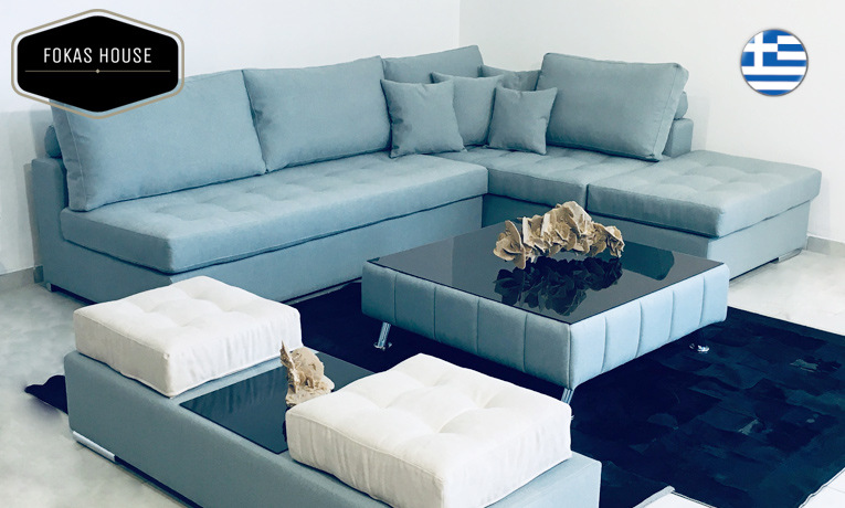 Σετ Σαλονιού με 5θέσιο Γωνιακό Καναπέ & Τραπεζάκι/Σκαμπό, από Ύφασμα ή Δερματίνη, από το Fokas House