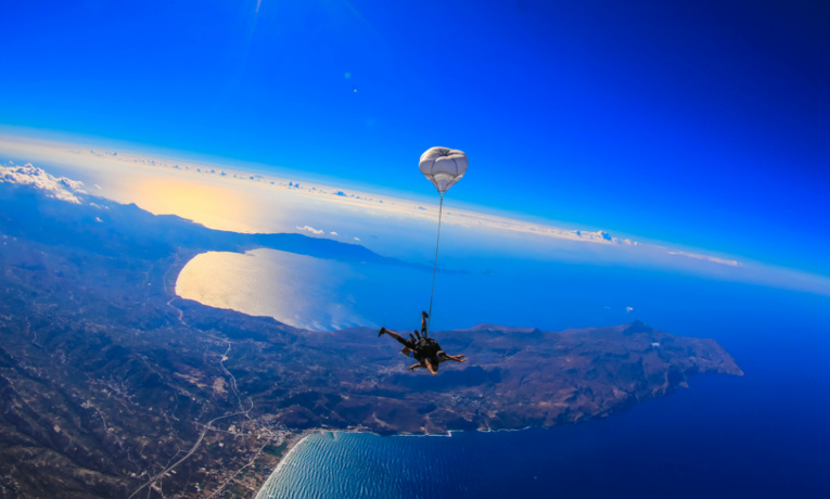 Αφού προσδεθείτε με ασφάλεια στον έμπειρο εκπαιδευτή σας μέσω μίας ειδικής εξάρτησης, θα εγκαταλείψετε το αεροσκάφος από το ύψος των 8000-14.000 ποδιών. Η αίσθηση της ελεύθερης πτώσης με ταχύτητα περίπου 220 χλμ/ώρα θα διαρκέσει για 1 λέπτο από τα 14.000 πόδια και 10 με 15 δευτερόλεπτα από τα 8.000 πόδια, πριν ο εκπαιδευτής σας ανοίξει το αλεξίπτωτο. Θα πετάξετε μαζί του για άλλα 5-7 λεπτά, πριν προσγειωθείτε με ασφάλεια στο γρασίδι της ζώνης ρίψεων.
